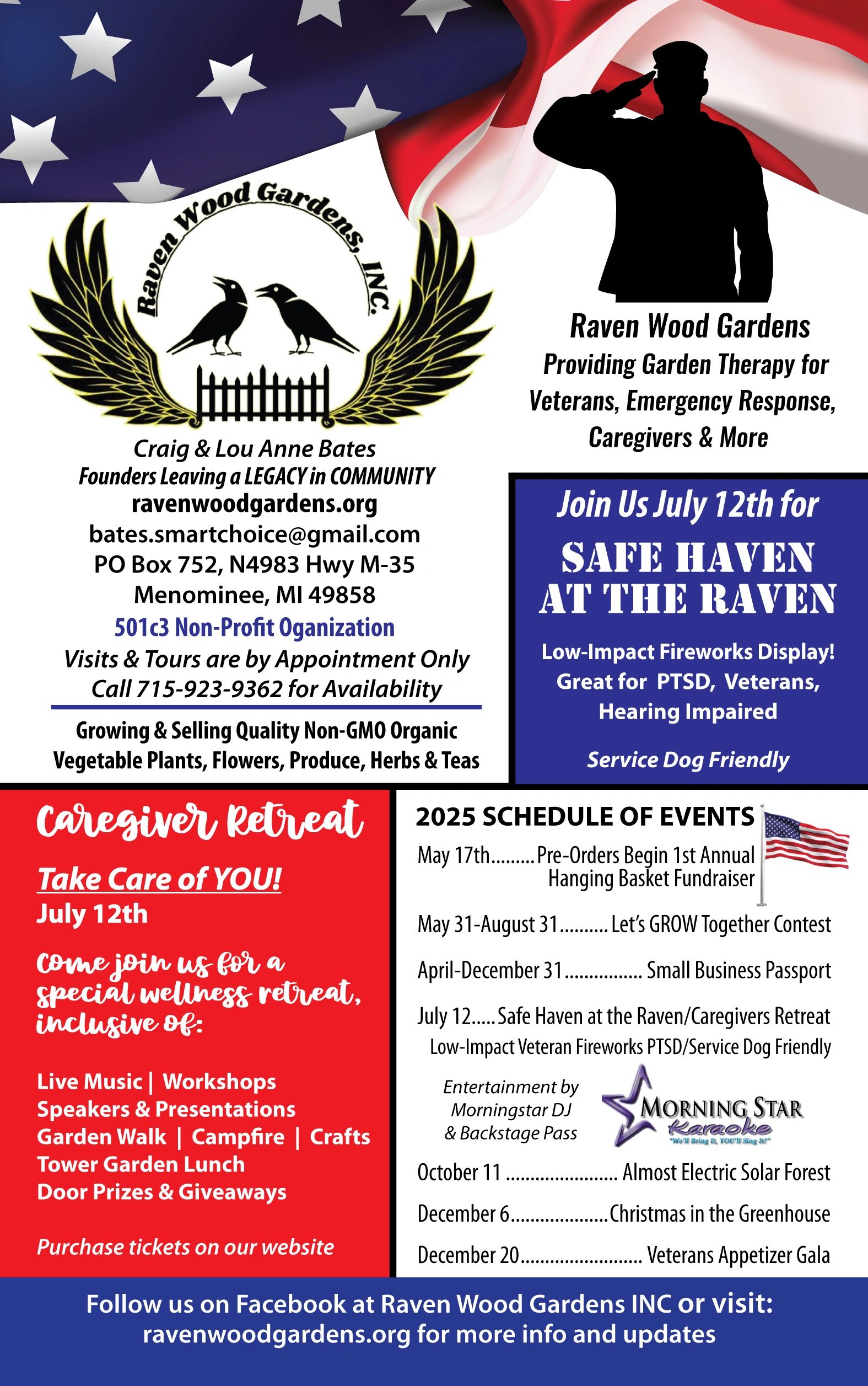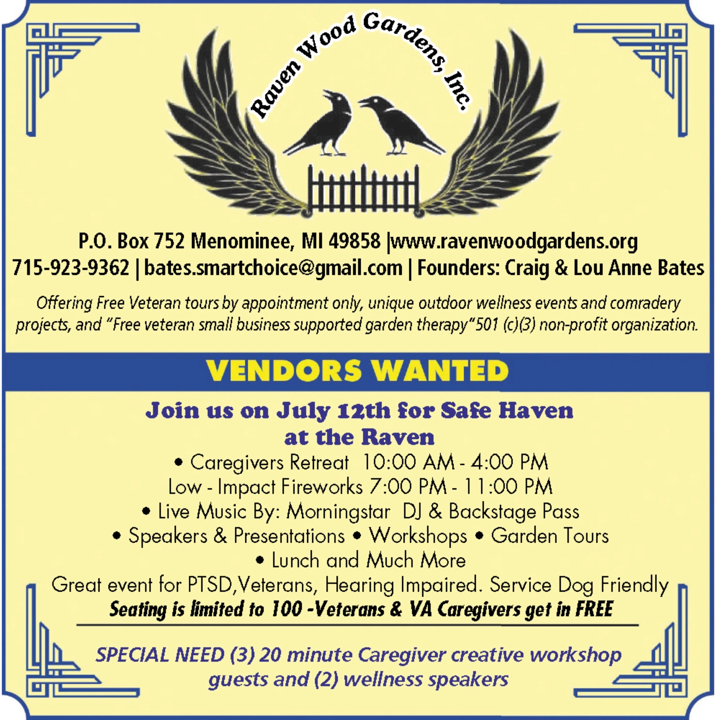 Vendors - ALL EVENTS Raffle Prizes Donations - ALL EVENTS Caregivers Retreat, Safe Haven at the Raven Low Impact Fireworks, , Almost Electric Solar Forest Event, Christmas in the Greenhouse. Call: Lou Anne at (715) 923-9362